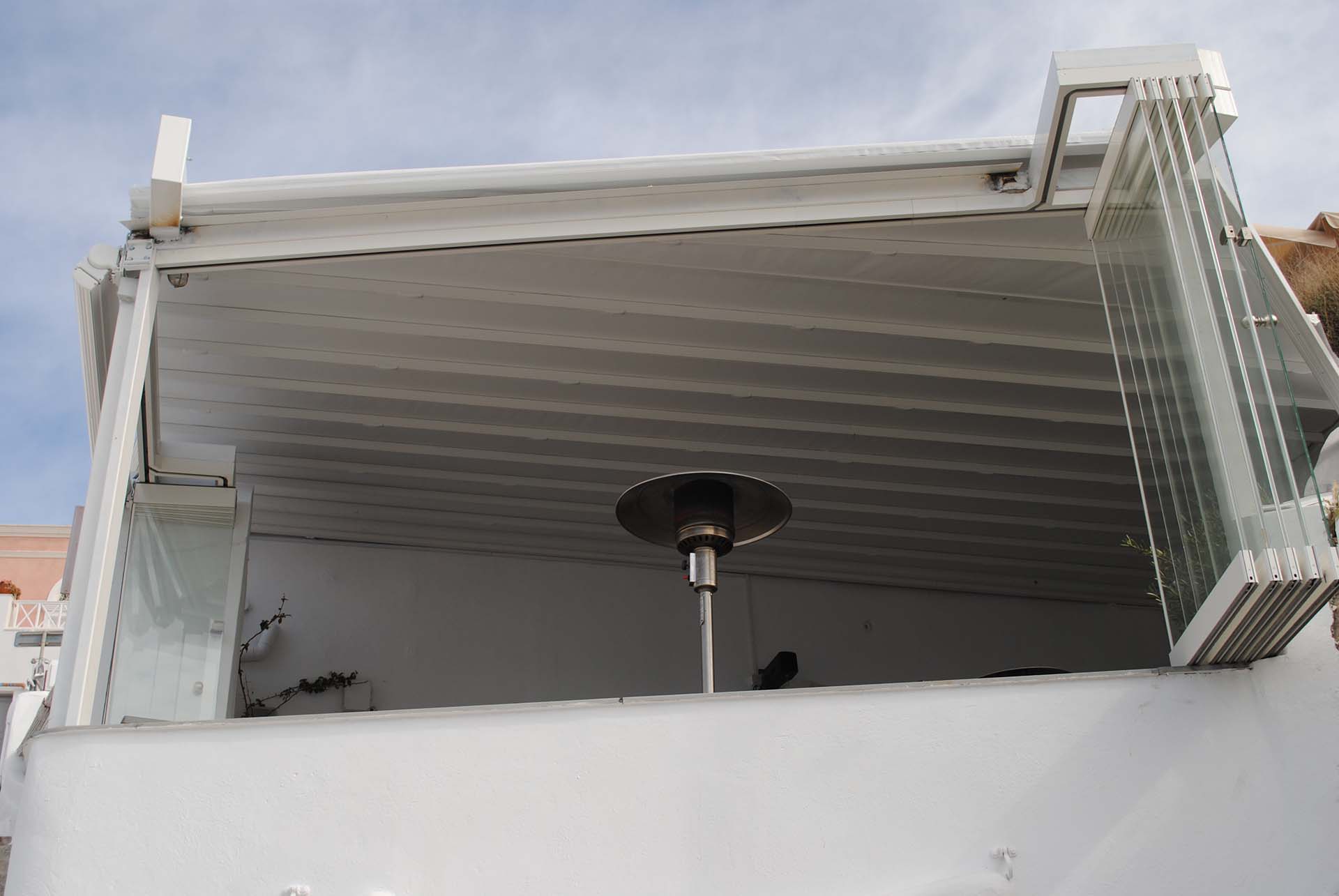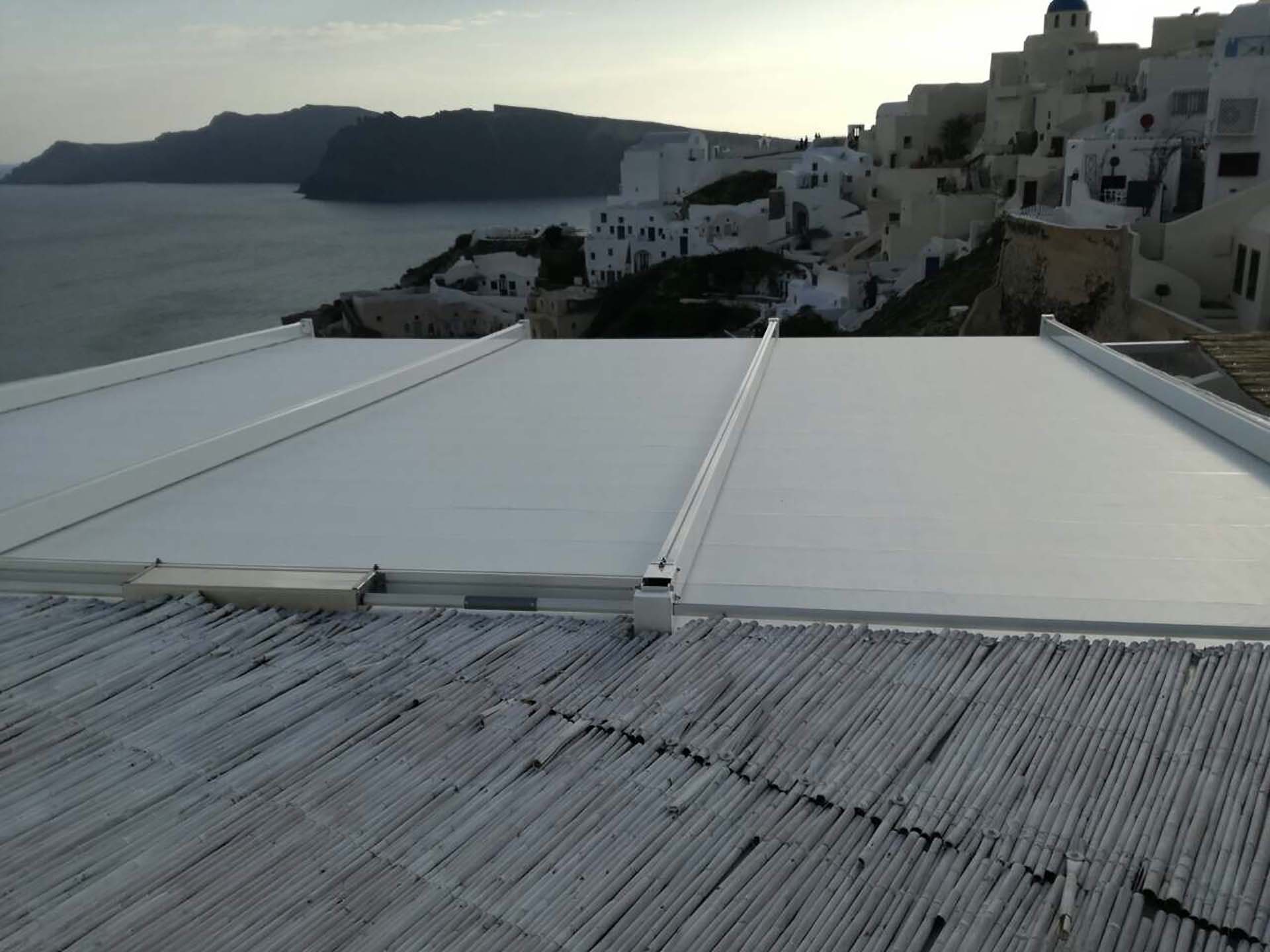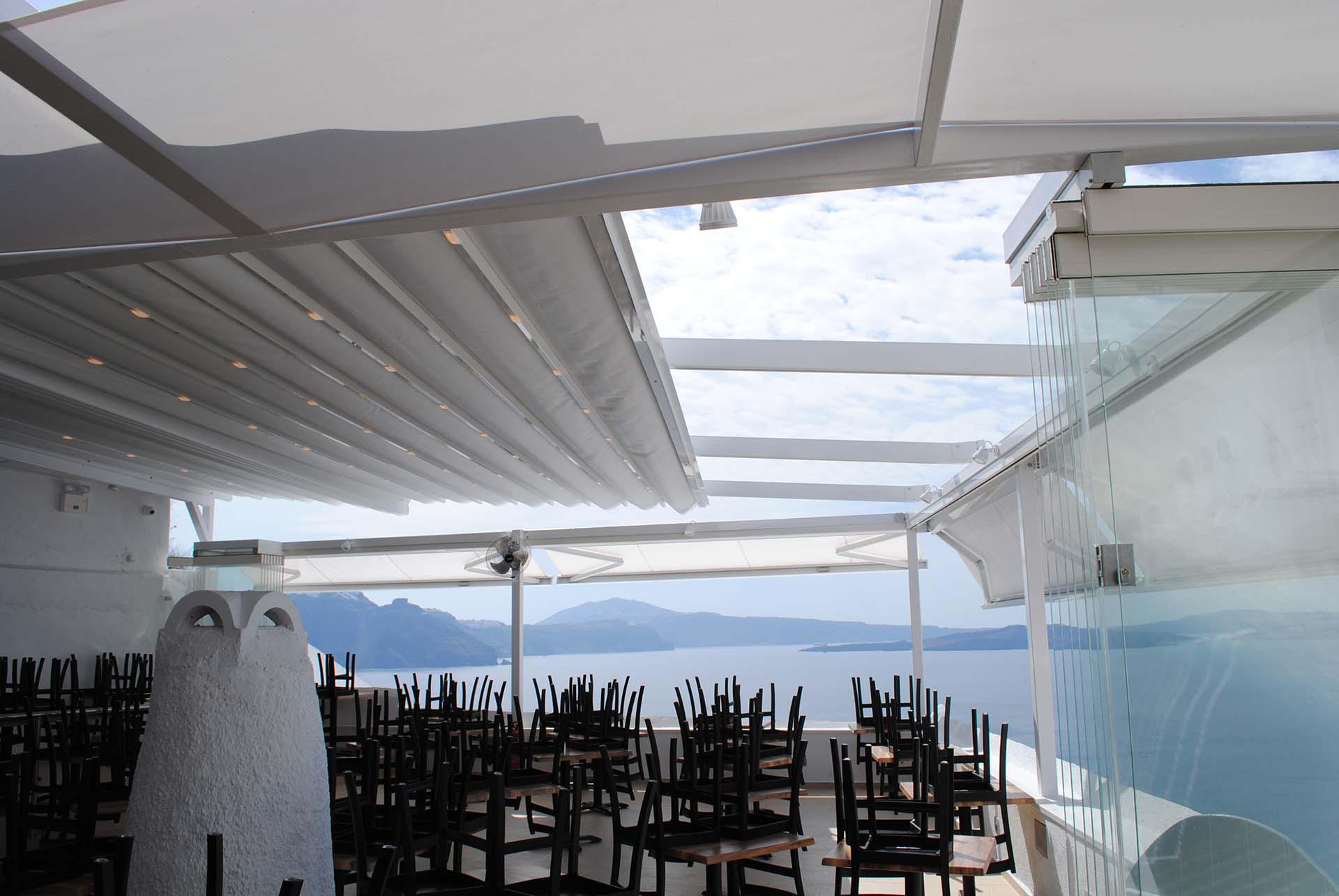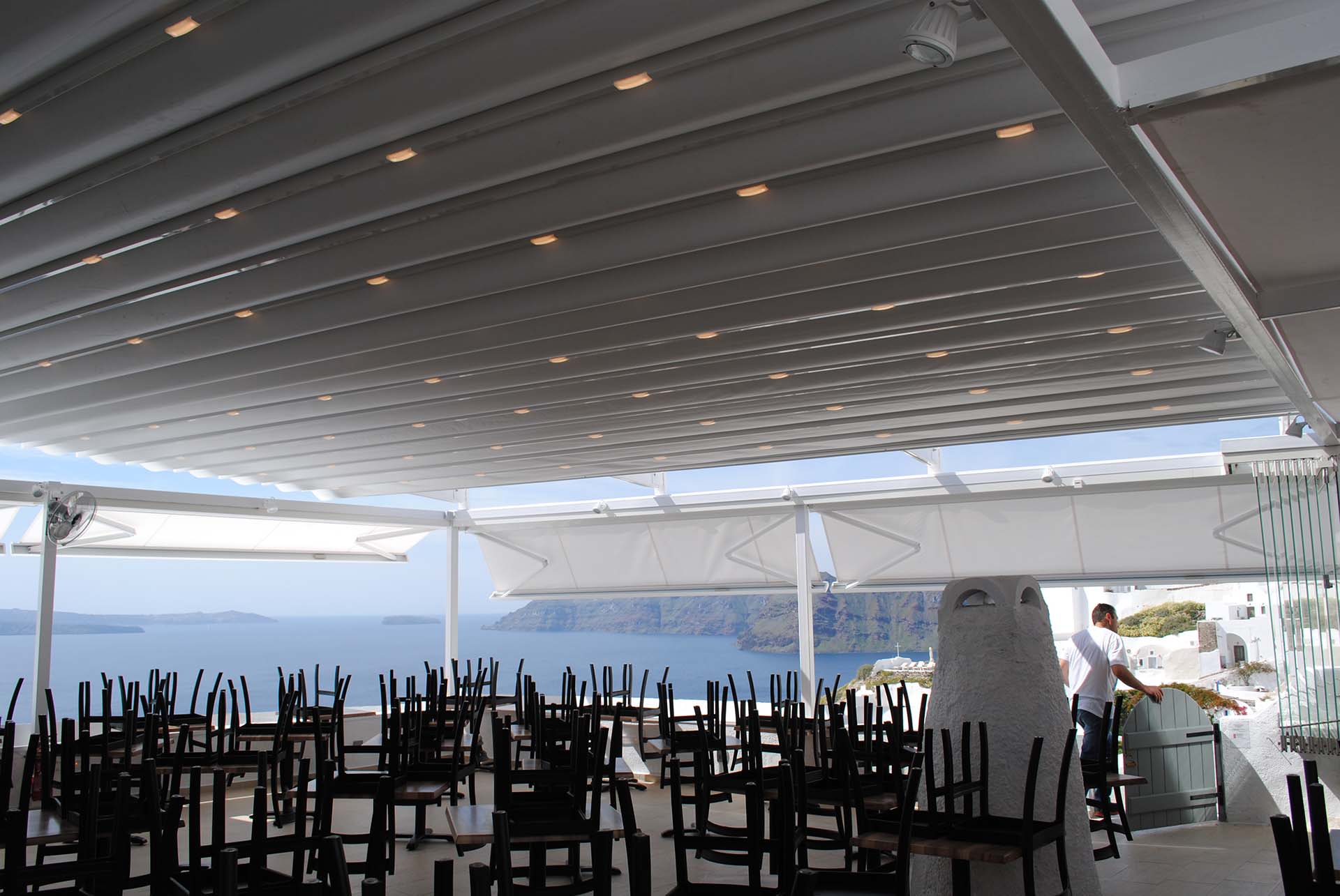 Ανοιγοκλειόμενη οροφή με αυτοματισμό για τη στέγαση και σκίαση του υπαίθριου χώρου του εστιατορίου Floga στη Σαντορίνη.
