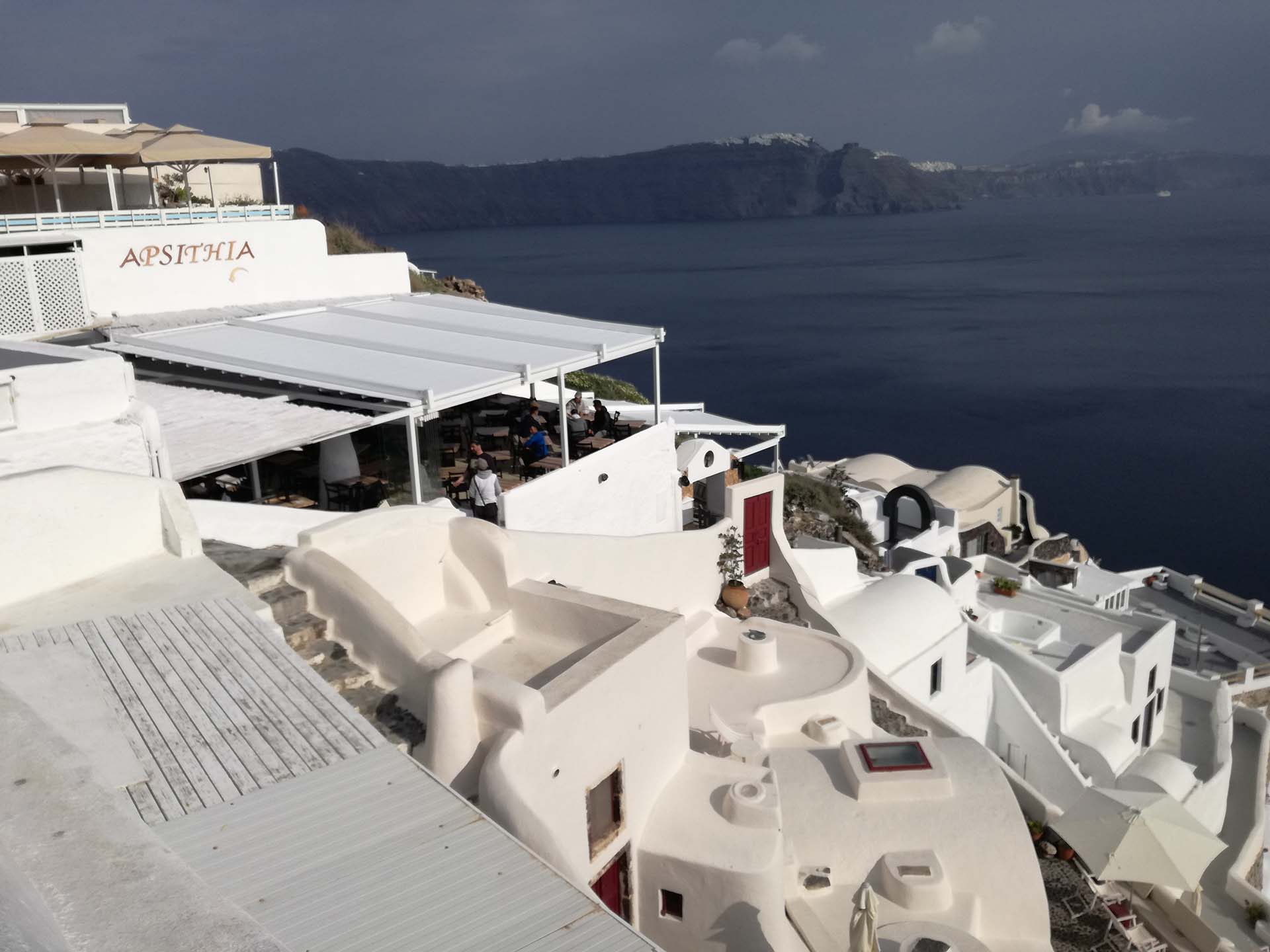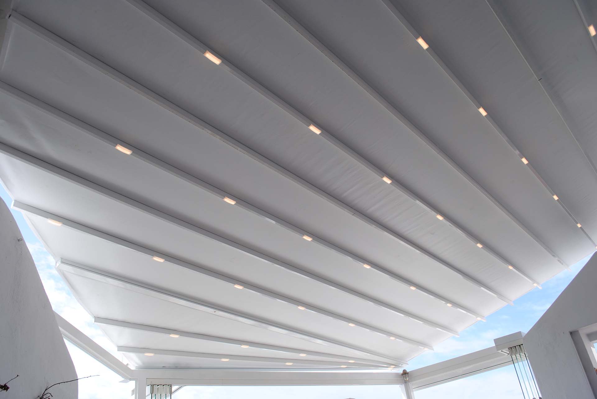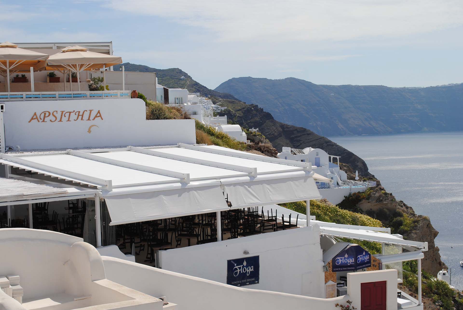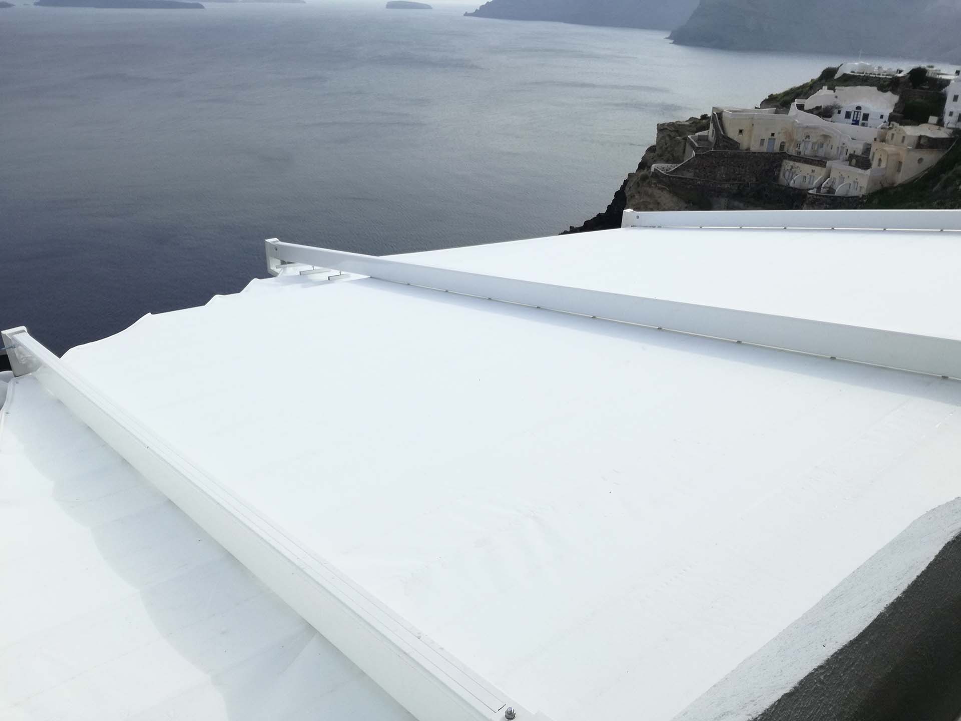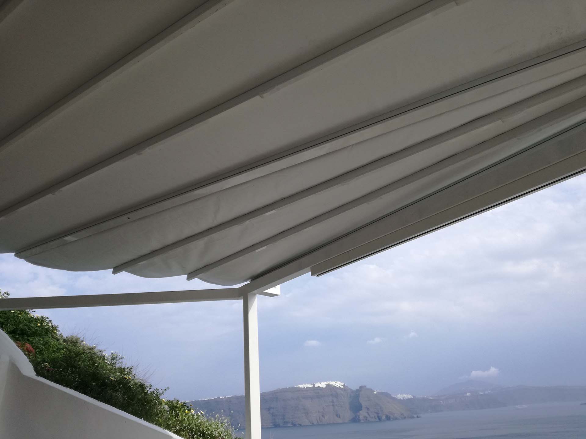 Ανοιγοκλειόμενη οροφή με αυτοματισμό για τη στέγαση και σκίαση του υπαίθριου χώρου του εστιατορίου Floga στη Σαντορίνη.