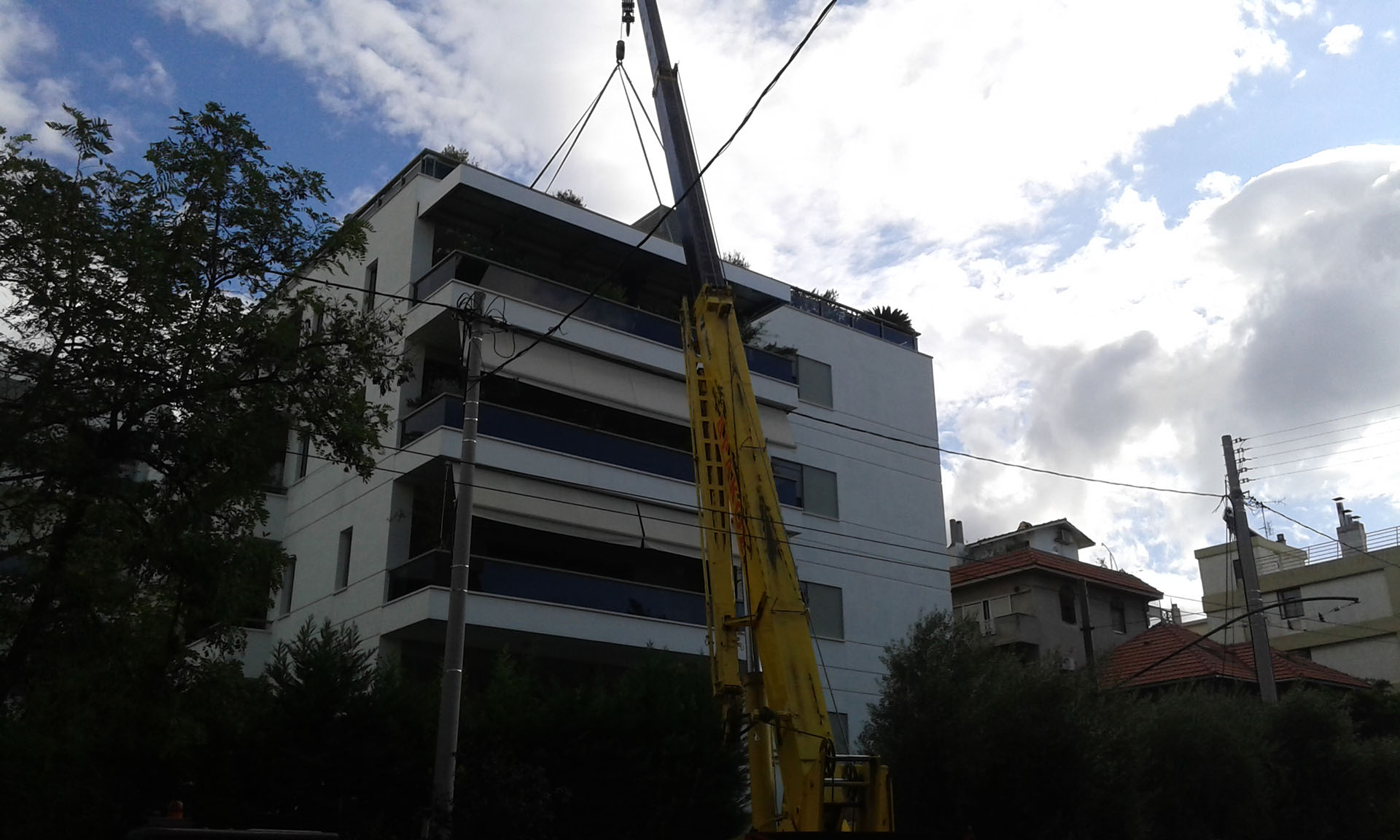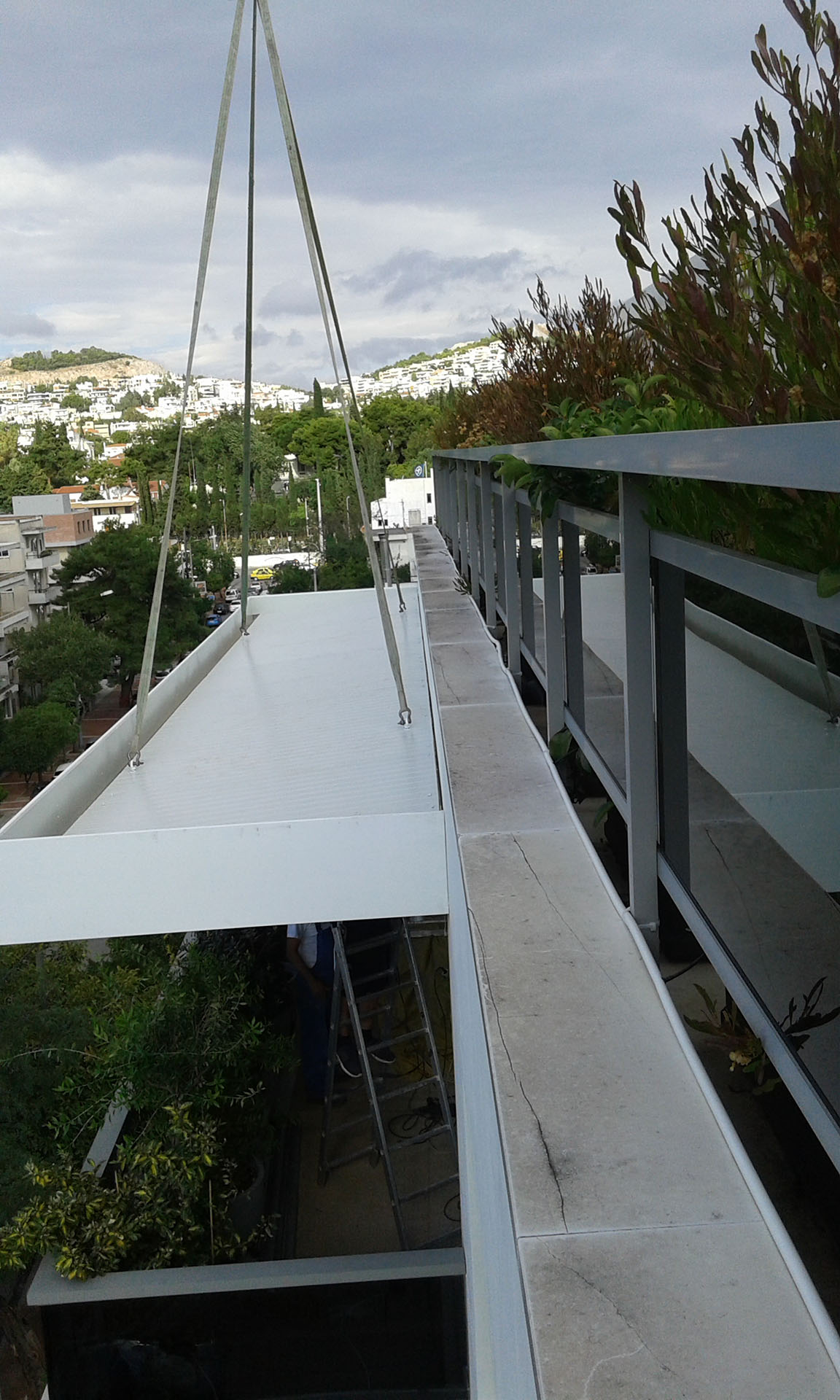 Κατασκευή και τοποθέτηση στεγάστρου - μαρκίζα πάνω από μπαλκόνι σε διαμέρισμα πολυκατοικίας, όμοιου αισθητικά με τα υπάρχοντα. Το στέγαστρο είναι κατασκευασμένο από μέταλλο και είναι καλυμμένο εξωτερικά με πάνελ πουλυουρεθάνης και εσωτερικά με ψευδοροφή και προορίζεται για τη σκίαση και προστασία από τη βροχή της βεράντας.