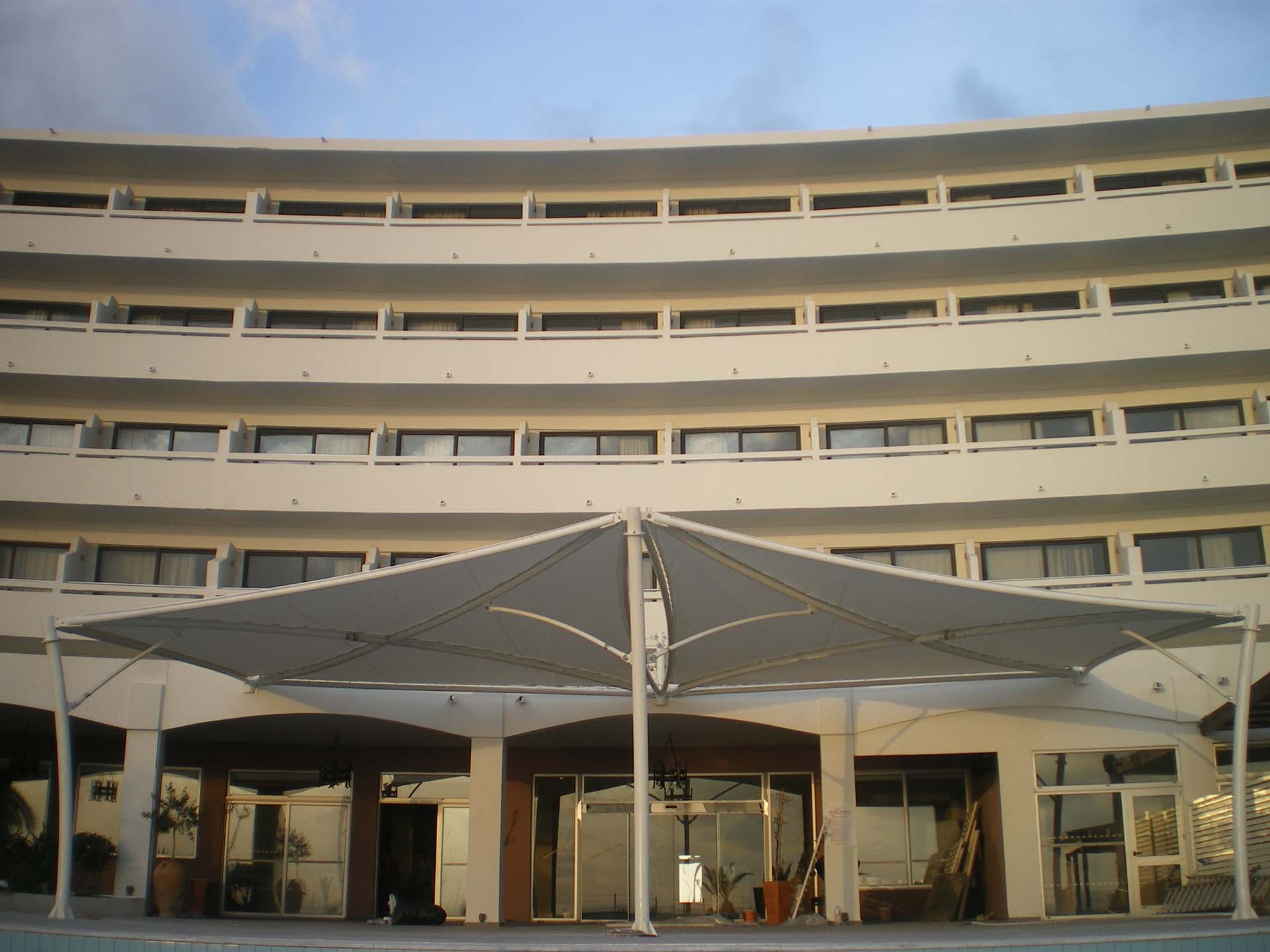 Σταθερό στέγαστρο συναρμολογούμενο και κατασκευασμένο βάση αρχιτεκτονικής μελέτης σε ξενοδοχείο της Ρόδου. Η διάστασή του είναι 8x18 μέτρα και ο σκοπός του είναι να στεγάσει την είσοδο του ξενοδοχείου.