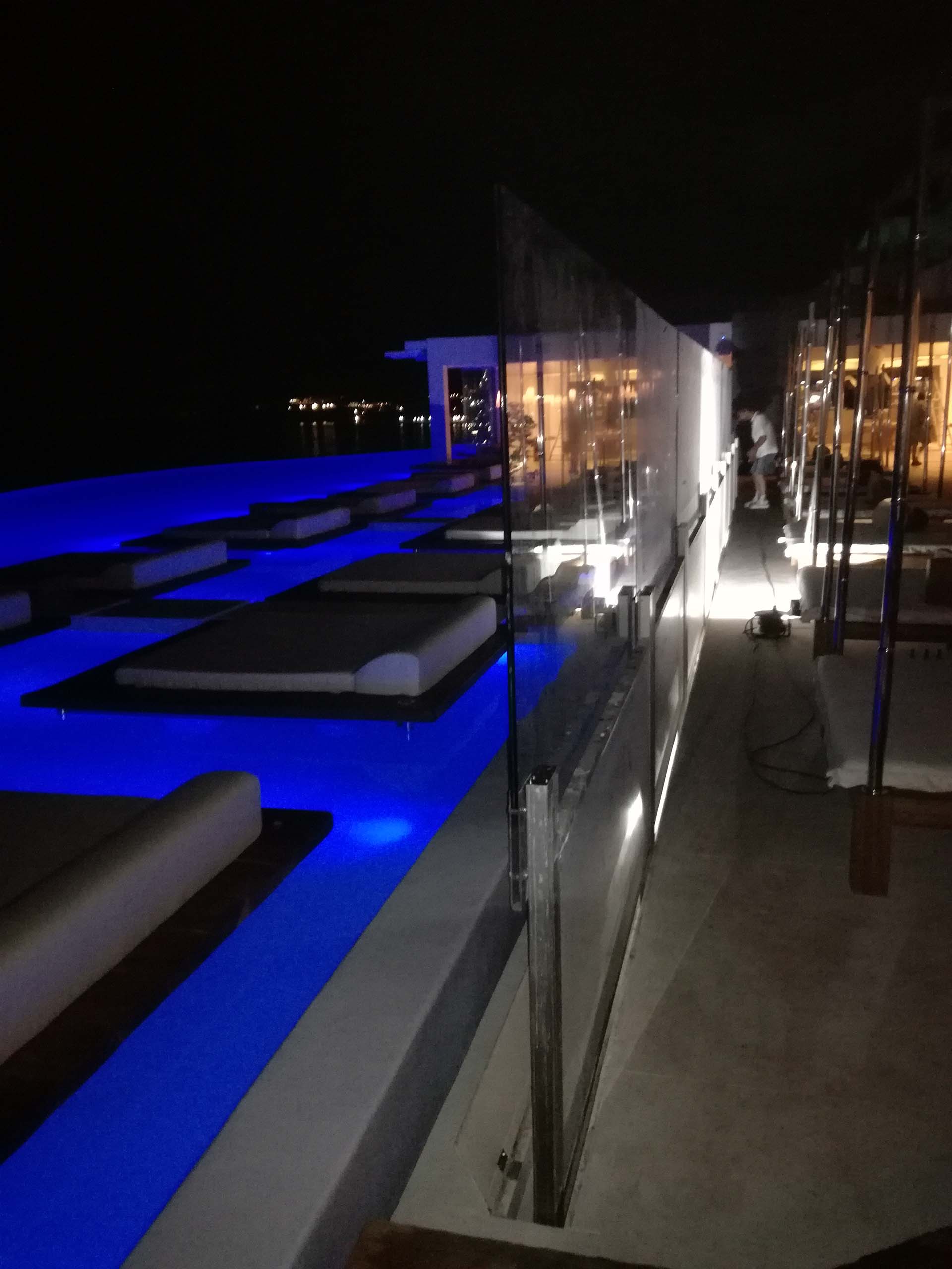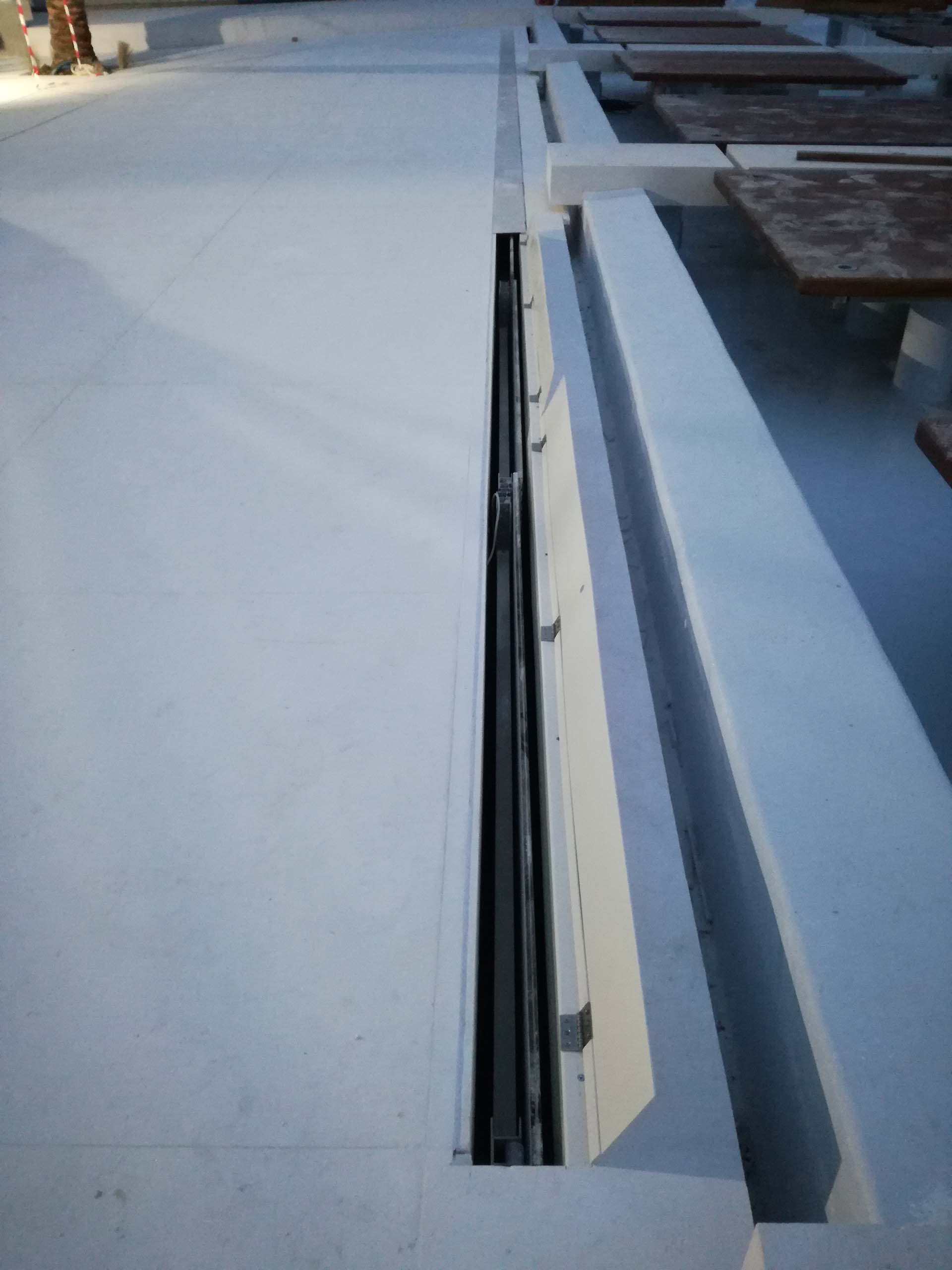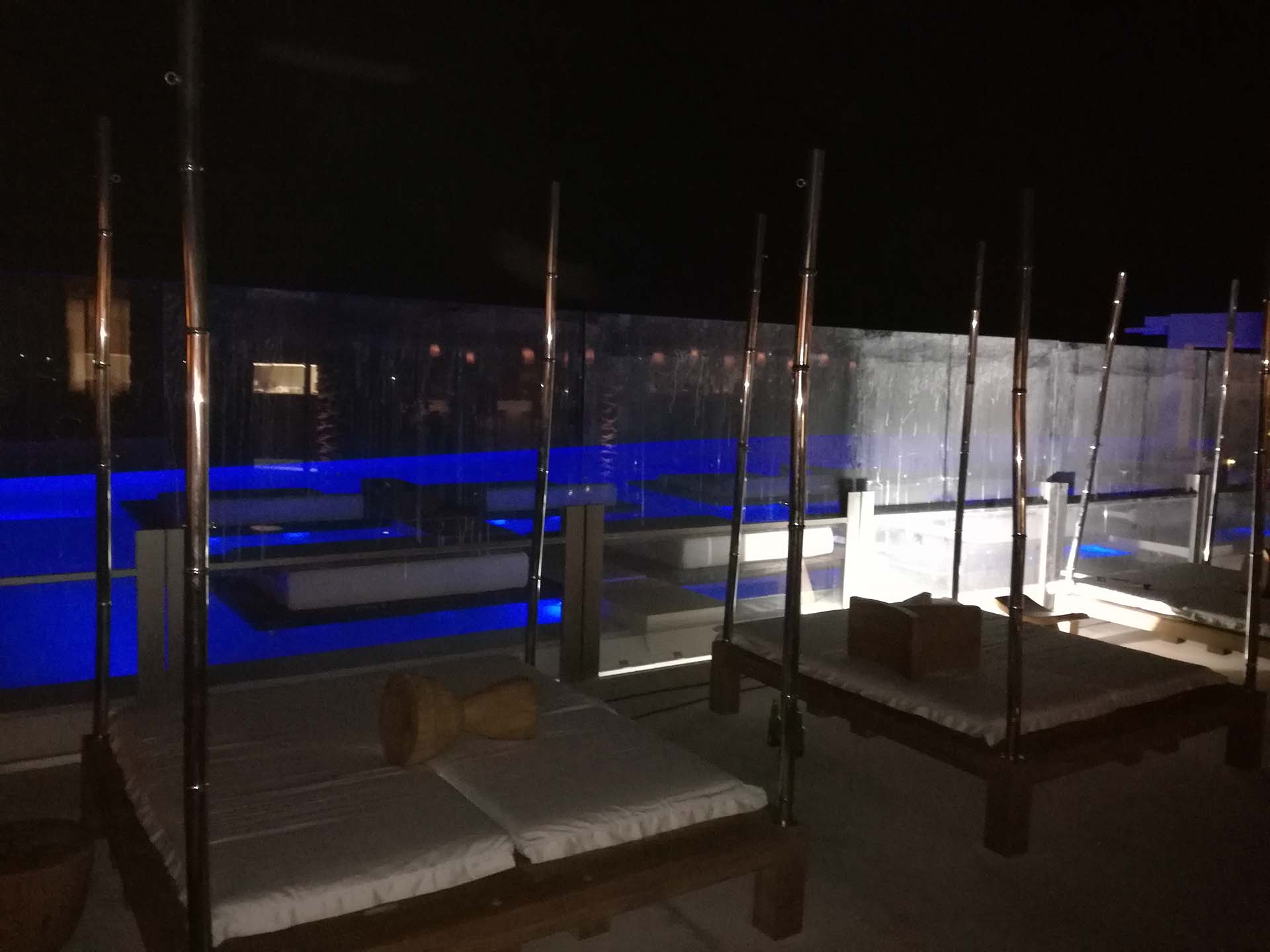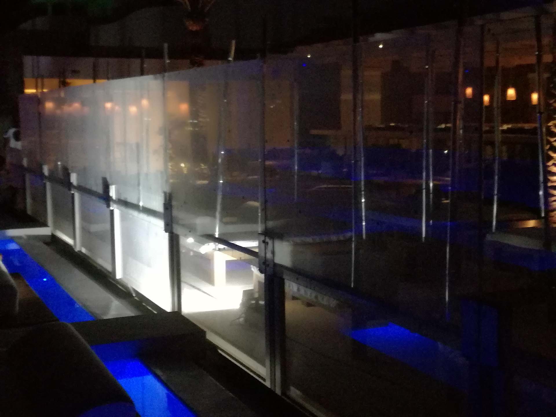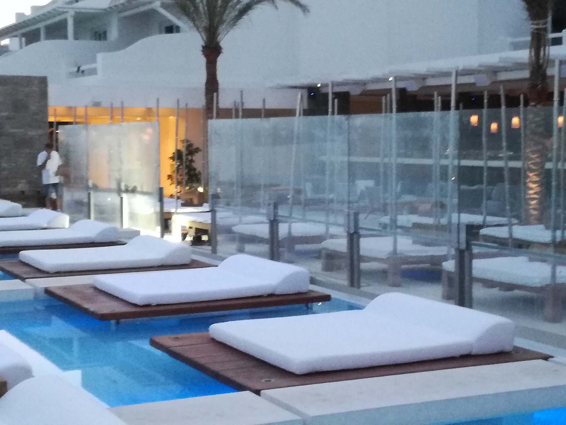 Προστασία από τους ανέμους στο προαύλιο του ξενοδοχείου Cavo Tagoo στη Μύκονο στο χώρο του εστιατορίου και της πισίνας. Η κατασκευή έχει μήκος 20 μέτρων και ανασύρεται κάτω από το έδαφος με αναδιπλούμενα τζάμια σε ύψος 2,25 μέτρων. Η λειτουργία τους είναι τηλεχειριζόμενη. Όταν αποσύρονται δεν αφήνουν κανένα μεταλλικό στοιχείο στον χώρο.