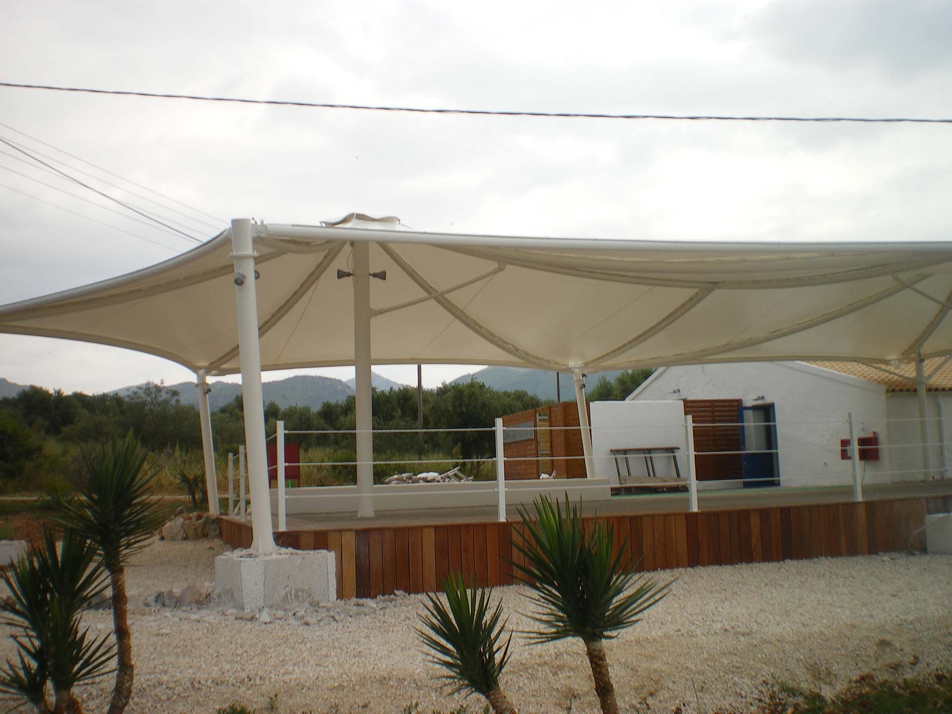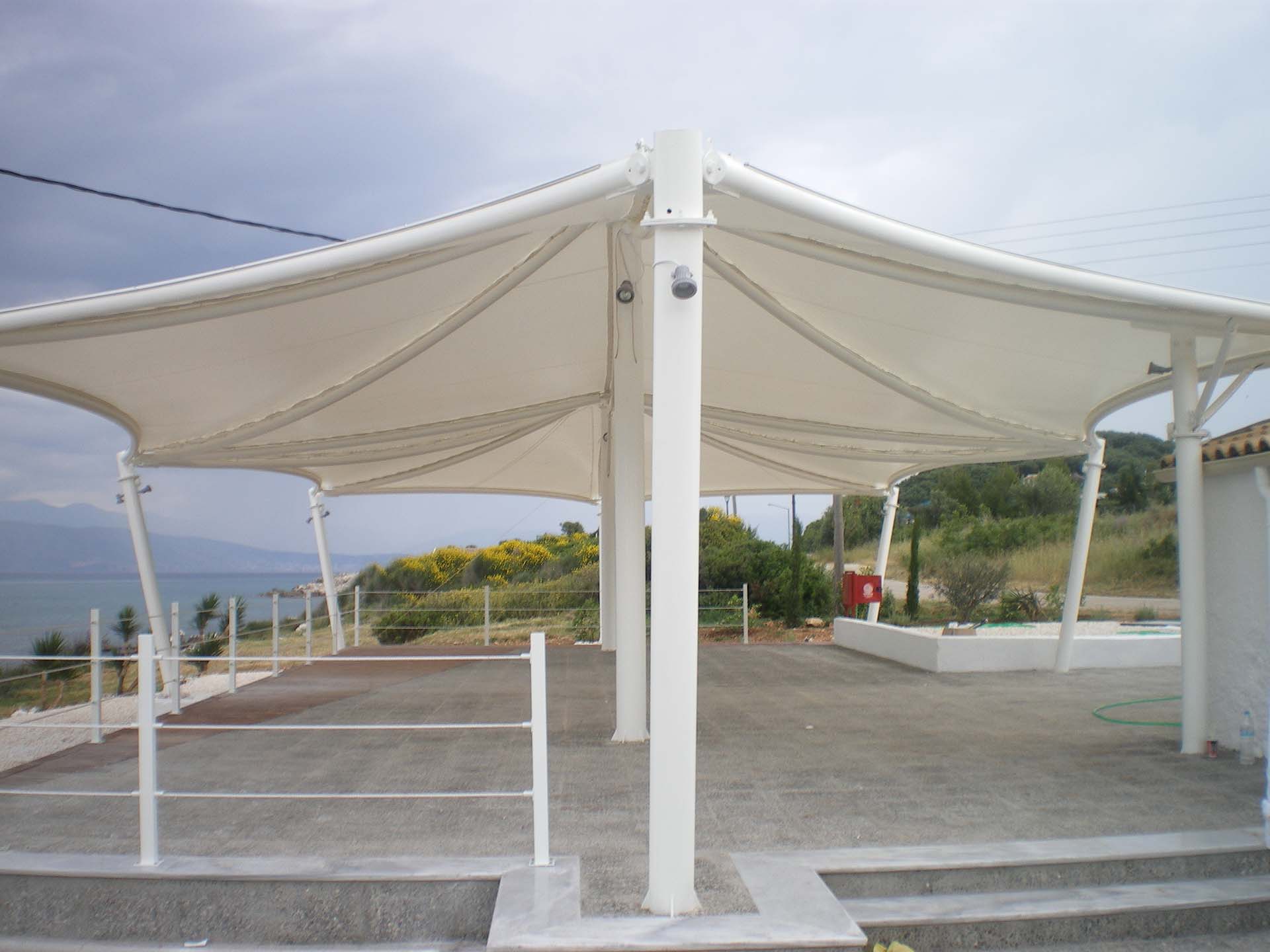 Σταθερό στέγαστρο συναρμολογούμενο και κατασκευασμένο βάση αρχιτεκτονικής μελέτης σε ξενοδοχείο της Ρόδου. Η διάστασή του είναι 25x15 μέτρα και ο σκοπός του είναι να στεγάσει το εστιατόριο και το καφέ του ξενοδοχείου.