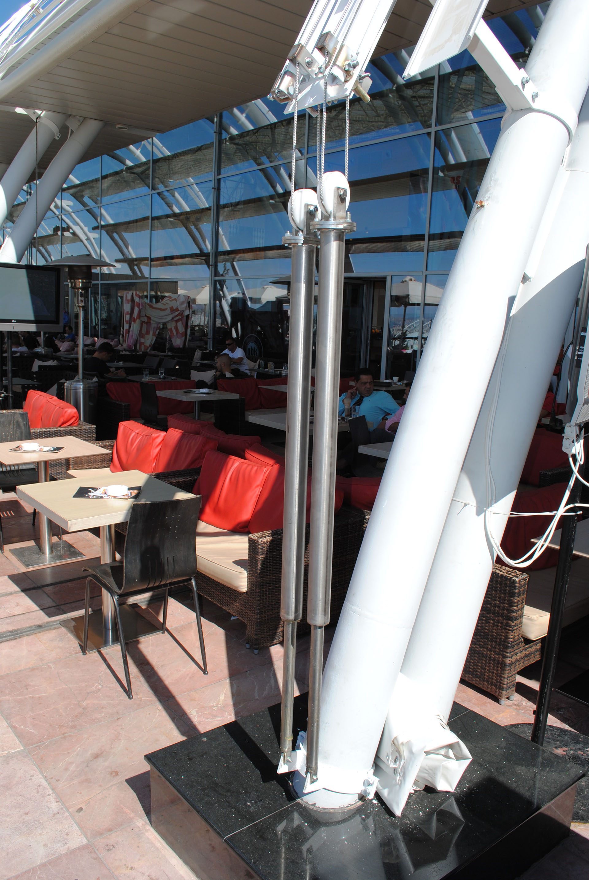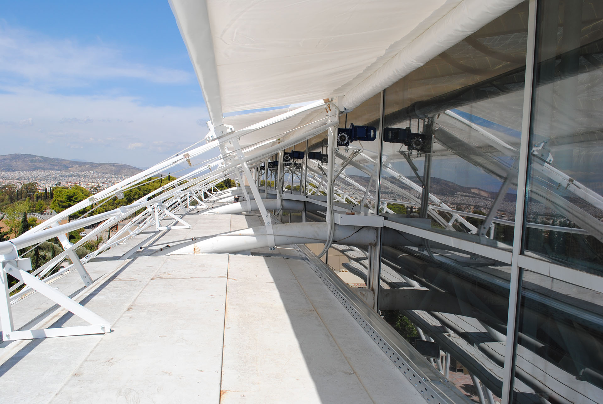 Η τέντα έχει ύψος 13μ και λειτουργεί με σύστημα προέντασης ειδικά κατασκευασμένο για το συγκεκριμένο έργο όπου οι απαιτήσεις λόγω της μεγάλης επιφάνειας είναι ιδιαίτερες. Όλη η δομή της κατασκευής είναι πατέντα η οποία κατασκευάστηκε ειδικά για το συγκεκριμένο έργο.
