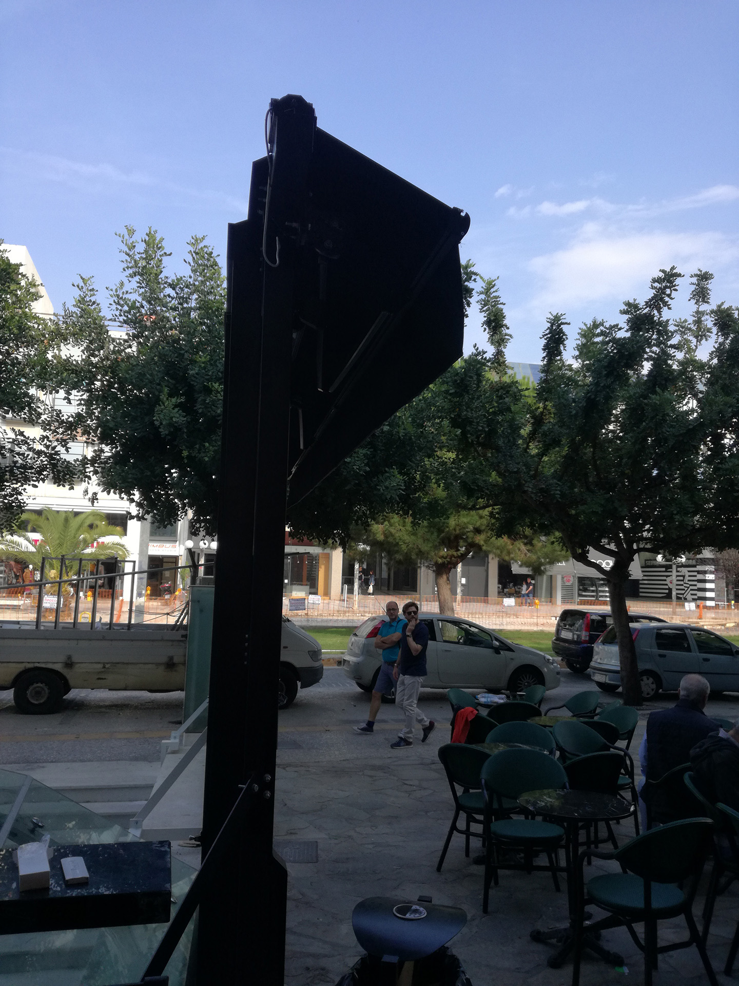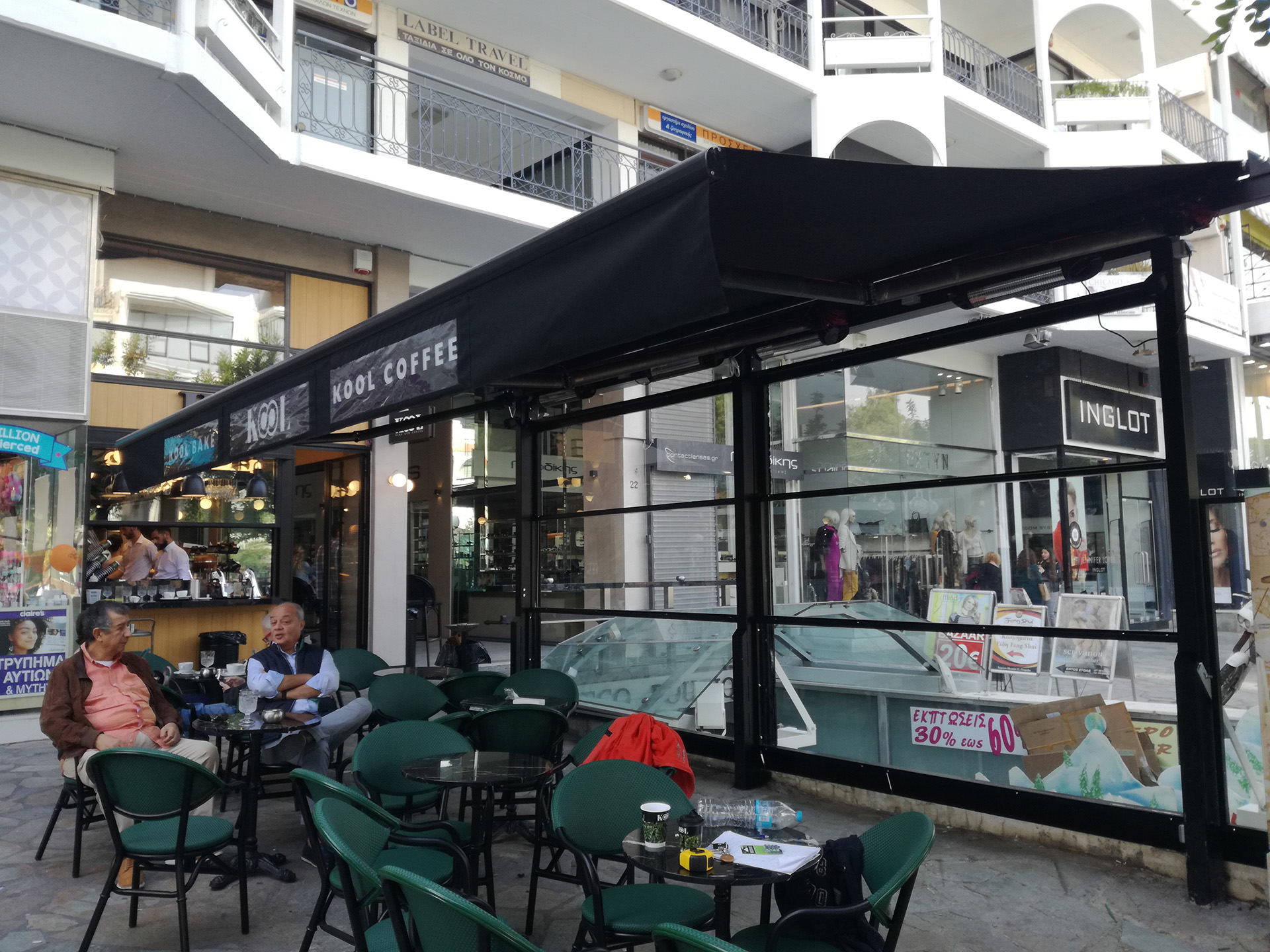 Η τέντα διαθέτει εντυπωσιακή φωτιζόμενη γλώσσα - επιγραφή για την καλύτερη προβολή της καφετέριας. Επιπρόσθετα οι ηλεκτρικά κινούμενοι ανεμοφράκτες τύπου «καρμανιόλα» παρέχουν προστασία του υπαίθριου χώρου από τον αέρα και την πλάγια βροχή.