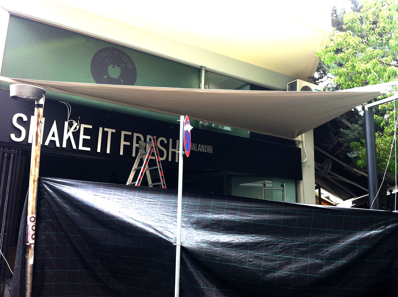 Ανοιγόμενη τρίγωνη τέντα στην καφετέρια Shake It Fresh Ανοιγόμενη τρίγωνη τέντα ειδικής κατασκευής για τη σκίαση υπαίθριου χώρου στην καφετέρια Shake It Fresh στο Χαλάνδρι. Τρίγωνη τέντα Σύστημα σκίασης