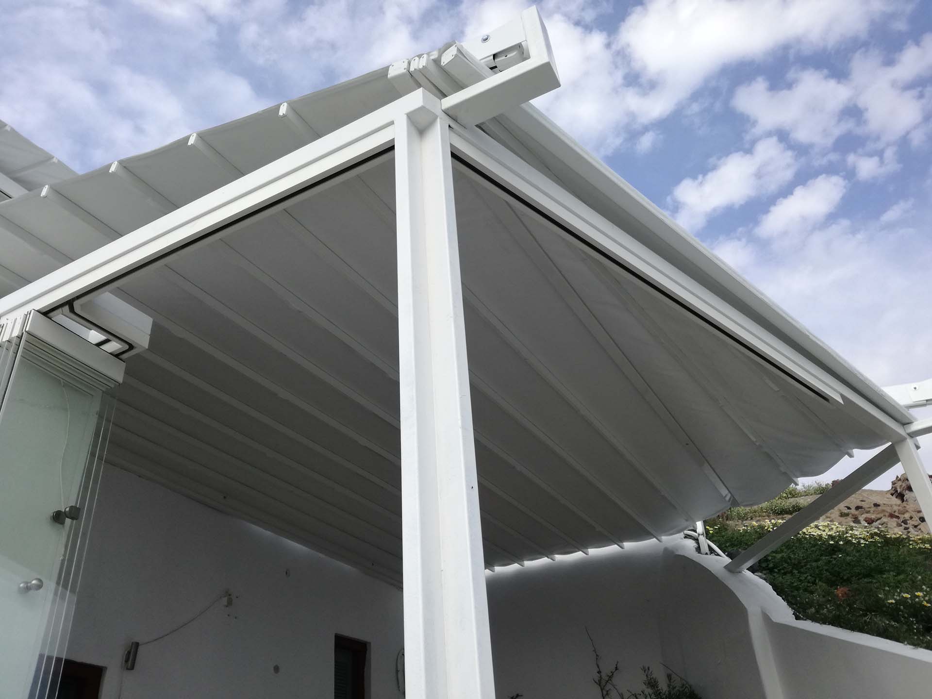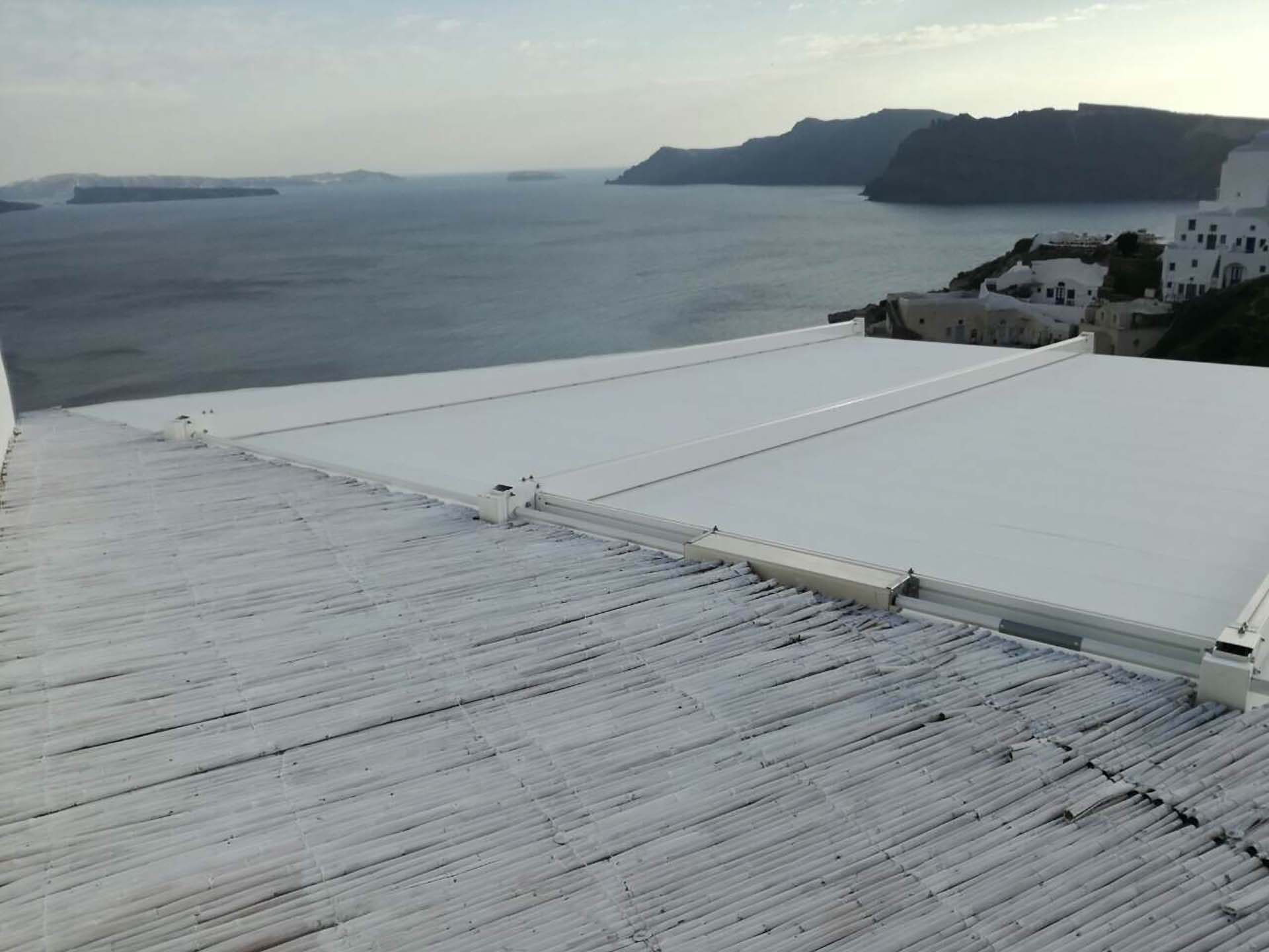 Ανοιγοκλειόμενη οροφή με αυτοματισμό για τη στέγαση και σκίαση του υπαίθριου χώρου του εστιατορίου Floga στη Σαντορίνη.