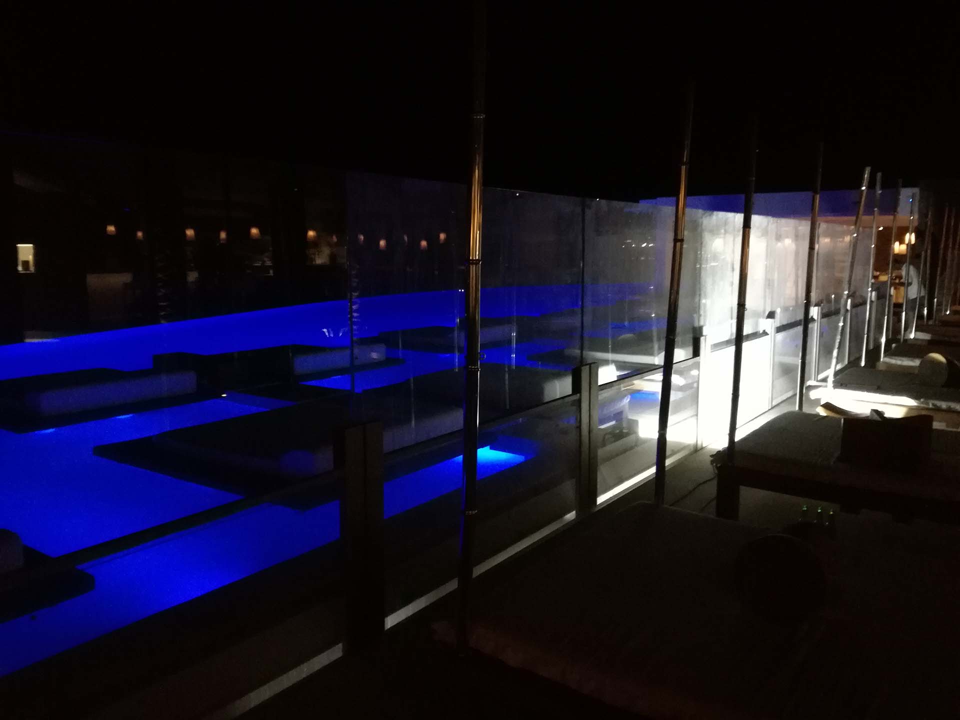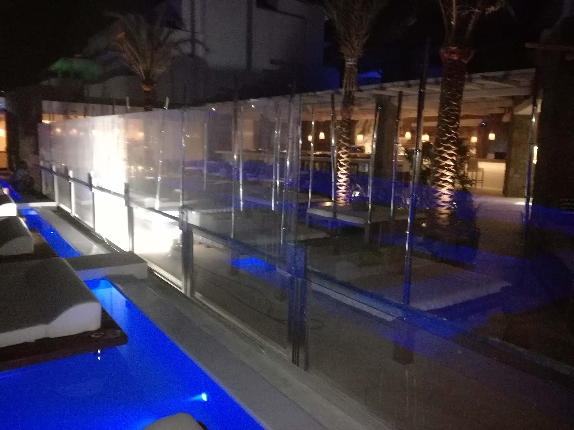 Προστασία από τους ανέμους στο προαύλιο του ξενοδοχείου Cavo Tagoo στη Μύκονο στο χώρο του εστιατορίου και της πισίνας. Η κατασκευή έχει μήκος 20 μέτρων και ανασύρεται κάτω από το έδαφος με αναδιπλούμενα τζάμια σε ύψος 2,25 μέτρων. Η λειτουργία τους είναι τηλεχειριζόμενη. Όταν αποσύρονται δεν αφήνουν κανένα μεταλλικό στοιχείο στον χώρο.