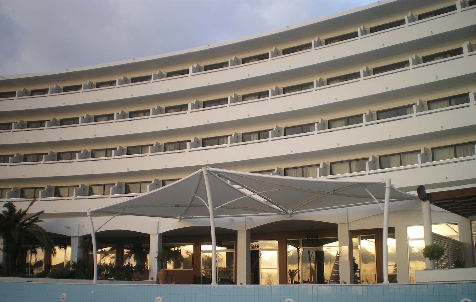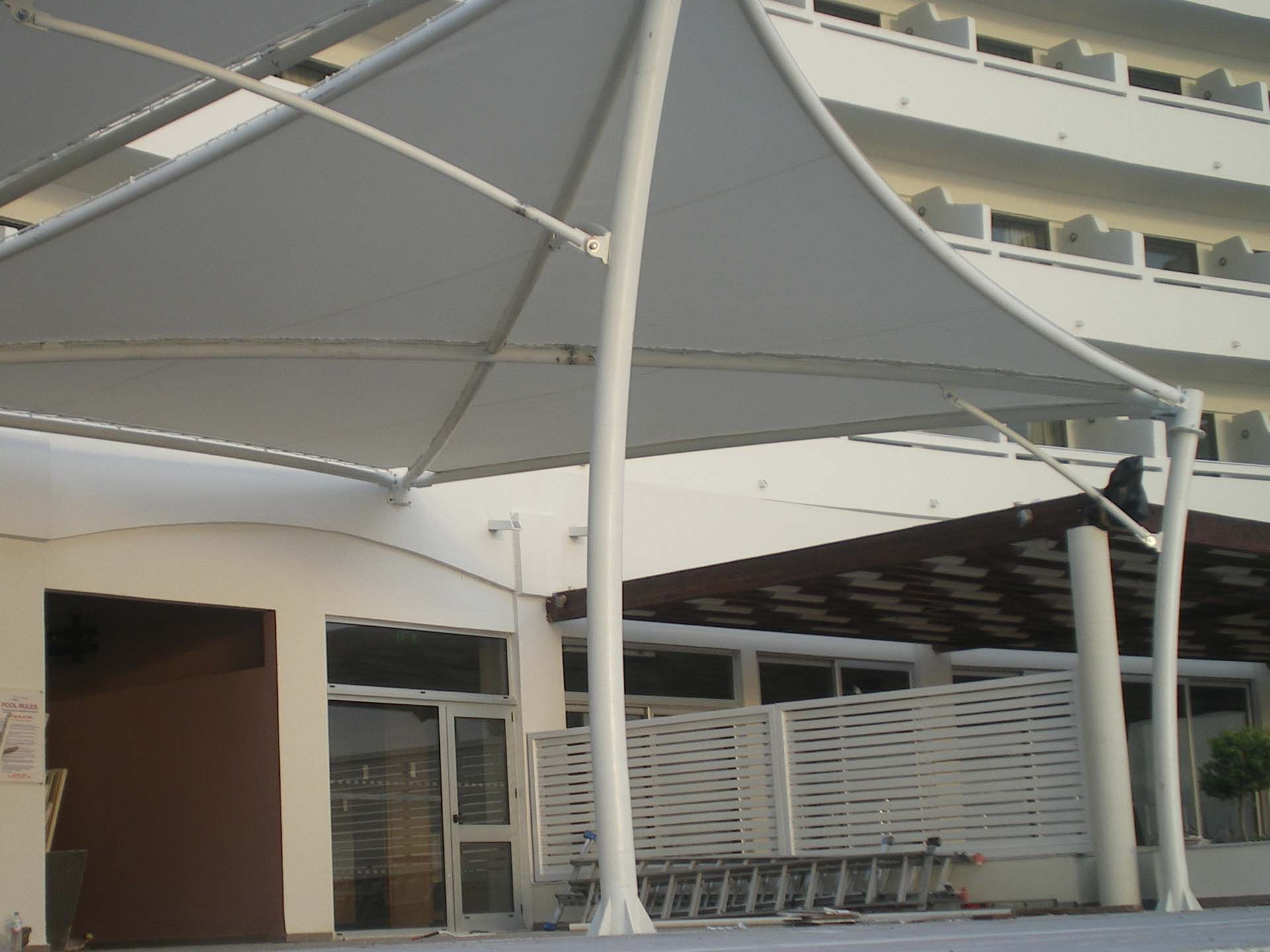 Σταθερό στέγαστρο συναρμολογούμενο και κατασκευασμένο βάση αρχιτεκτονικής μελέτης σε ξενοδοχείο της Ρόδου. Η διάστασή του είναι 8x18 μέτρα και ο σκοπός του είναι να στεγάσει την είσοδο του ξενοδοχείου.
