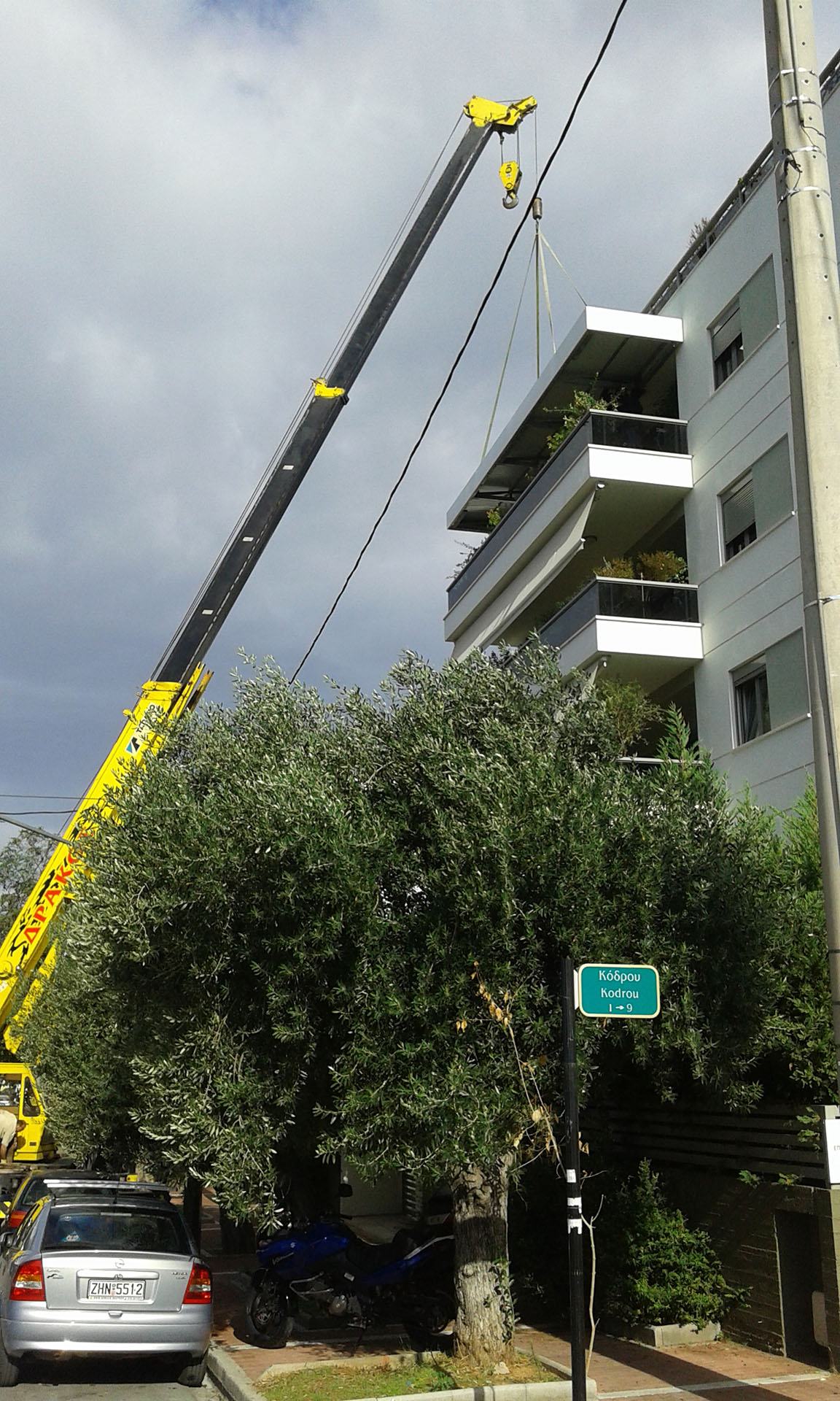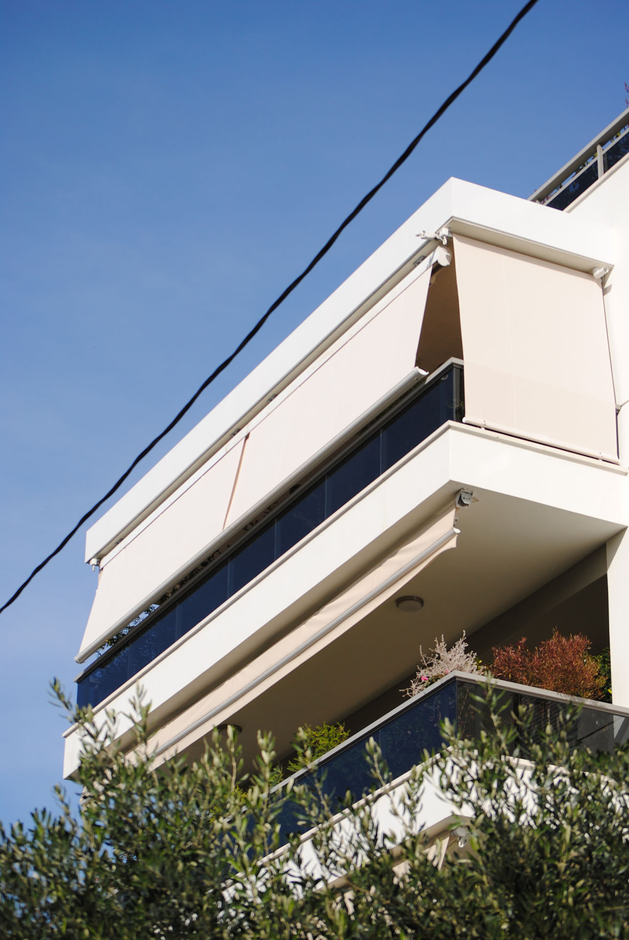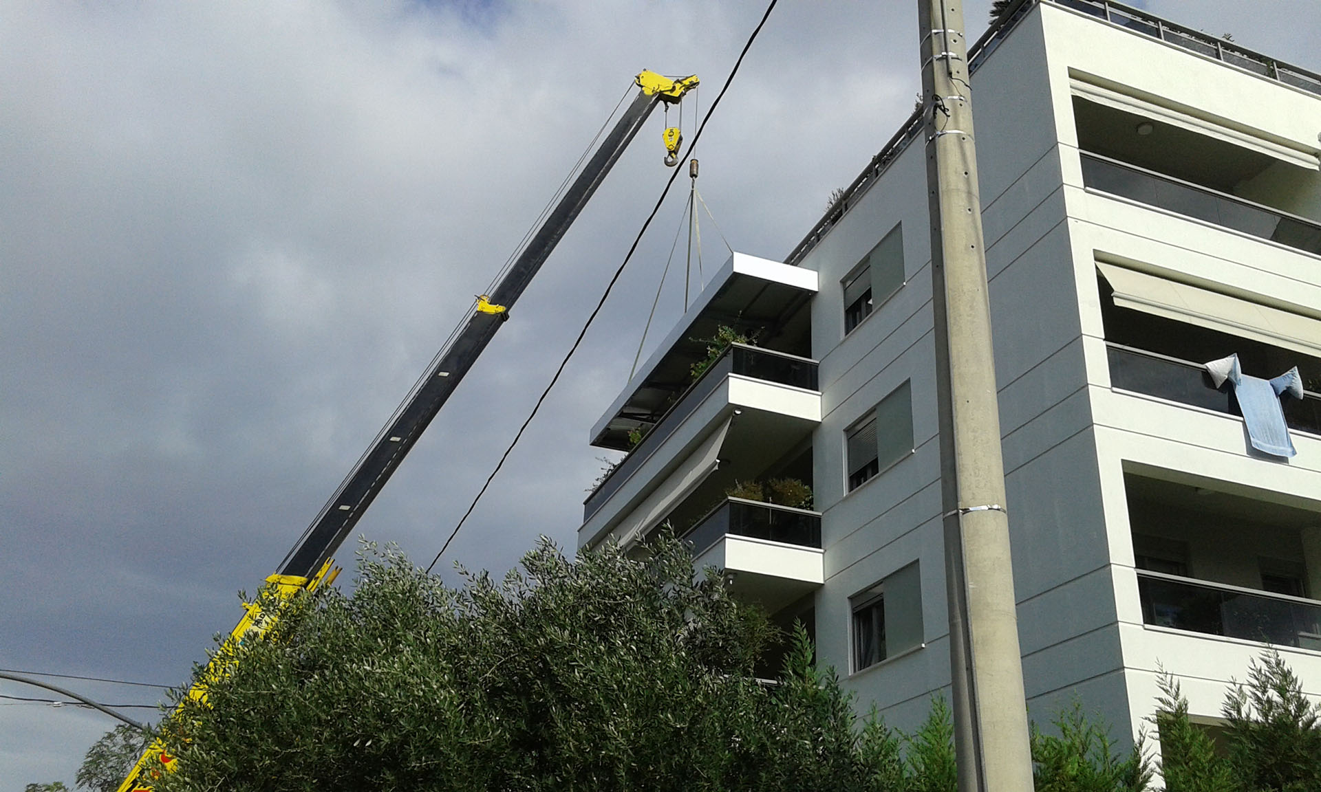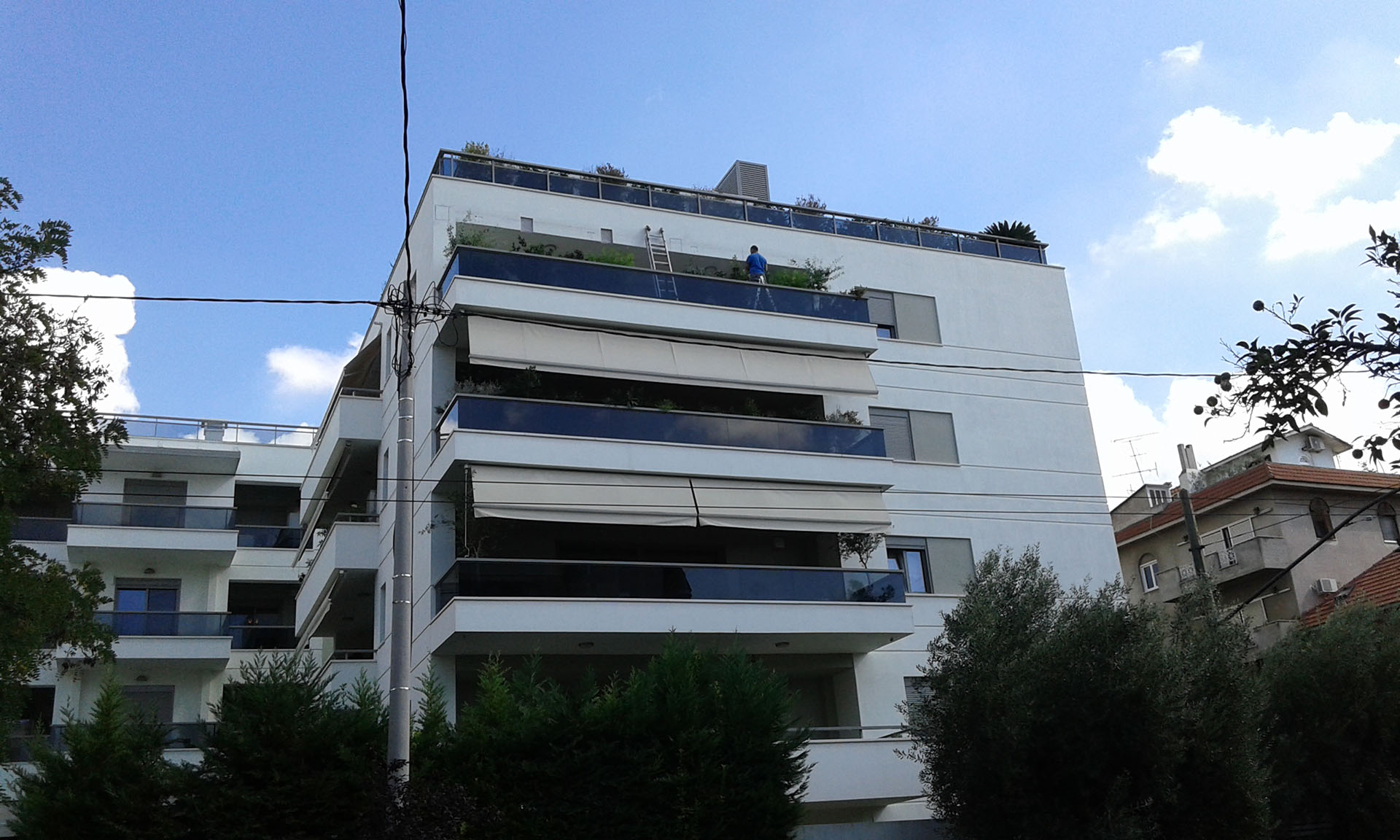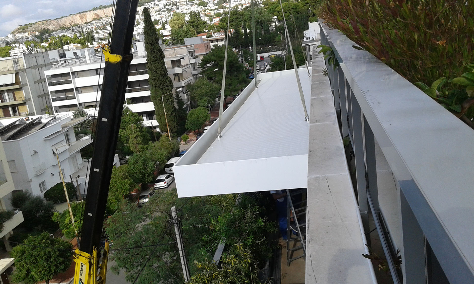 Κατασκευή και τοποθέτηση στεγάστρου - μαρκίζα πάνω από μπαλκόνι σε διαμέρισμα πολυκατοικίας, όμοιου αισθητικά με τα υπάρχοντα. Το στέγαστρο είναι κατασκευασμένο από μέταλλο και είναι καλυμμένο εξωτερικά με πάνελ πουλυουρεθάνης και εσωτερικά με ψευδοροφή και προορίζεται για τη σκίαση και προστασία από τη βροχή της βεράντας.