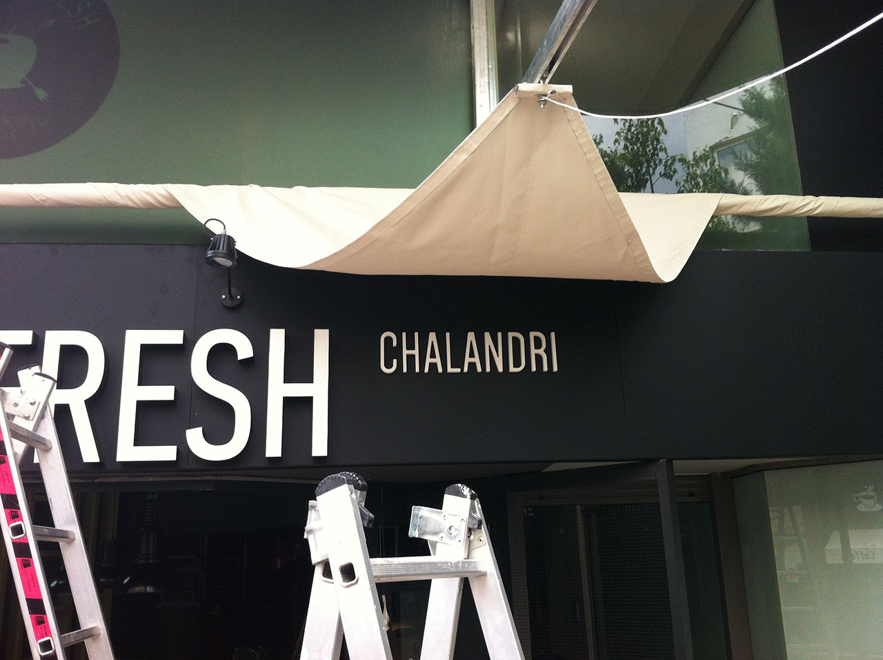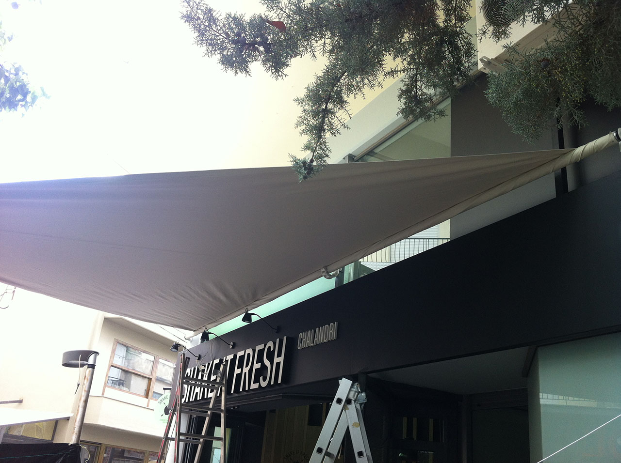 Ανοιγόμενη τρίγωνη τέντα στην καφετέρια Shake It Fresh Ανοιγόμενη τρίγωνη τέντα ειδικής κατασκευής για τη σκίαση υπαίθριου χώρου στην καφετέρια Shake It Fresh στο Χαλάνδρι. Τρίγωνη τέντα Σύστημα σκίασης